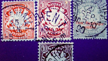 Beim Deutschen Reich findet man bei den Nummern 33 + 41 Hinweise zur Fluoreszenz bei den roten 10-Pfennig - Marken. Bei den gleichzeitig erschienenen bayerischen Wappen-Marken der # 49 und 54 x steht nichts. ich habe daraufhin etwa 1000 dieser Marken unter der Quarzlampe untersucht und habe folgendes herausgefunden: