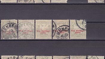 Deshalb sollte man nicht aufhören weiter Fragen zu stellen. Insbesondere hat sich noch niemand damit beschäftigt, inwieweit die 3 Gebiete, Bayern, Württemberg und Deutsches Reich mit gleichen oder sehr ähnlichen Farben parallel laufen. Ein sehr schönes Beispiel ist DR Mi 50 (früher auch Mi 51) und Württemberg Mi 58 und 59 (bzw. 211 und 213).