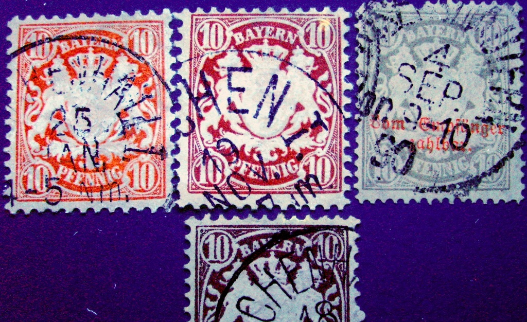 Beim Deutschen Reich findet man bei den Nummern 33 + 41 Hinweise zur Fluoreszenz bei den roten 10-Pfennig - Marken. Bei den gleichzeitig erschienenen bayerischen Wappen-Marken der # 49 und 54 x steht nichts. ich habe daraufhin etwa 1000 dieser Marken unter der Quarzlampe untersucht und habe folgendes herausgefunden: