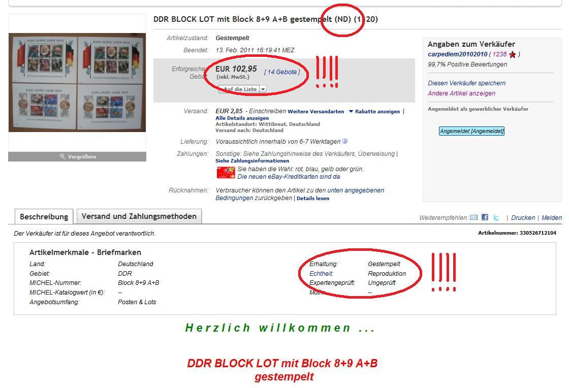 Das ND in der Überschrift kann man dem Verkäufer ja noch vorwerfen und auch das in der weiteren Beschreibung kein Wort mehr darüber verloren wird ABER die Beschreibung REPRODUKTION ist eindeutig! Wenn da nur stehen würde "ungeprüft", dann hätte ich Mitleid mit den Bietern und wäre richtig sauer auf den Verkäufer.