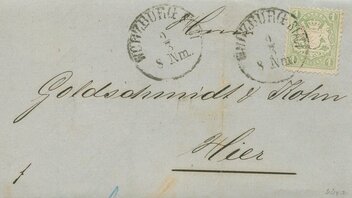 Das ist kein Kaufgesuch sondern die Bitte in Euren Sammlungen nachzusehen, ob Ihr auch solche Briefe habt. Es sind “Kontoauszüge” von der Kgl. Filalbank Würzburg, frankiert als Drucksache (Ortsbrief kostete auch nur 1 Kr.) mit der 1 Kr. Nr. 22 Wappenmarke. Schaut Euch bitte auch mal die Farbe der mittleren Marke an. Ist das eventuell schon die b-Farbe?