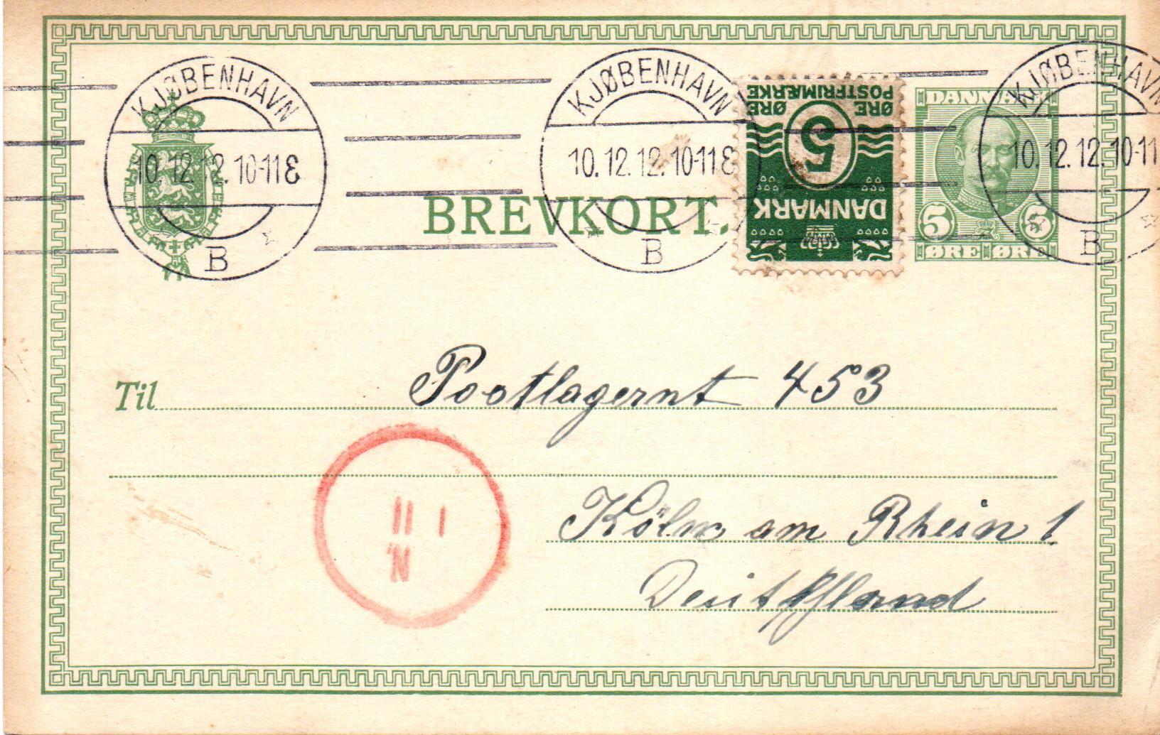 Ein 5 Öre Ganzsachenpostkarte König Frederik VIII, nichts besonderes. 5 Öre Wellentype als Zusatzfrankatur zur Darstellung des Auslandsportos, auch nichts besonderes.