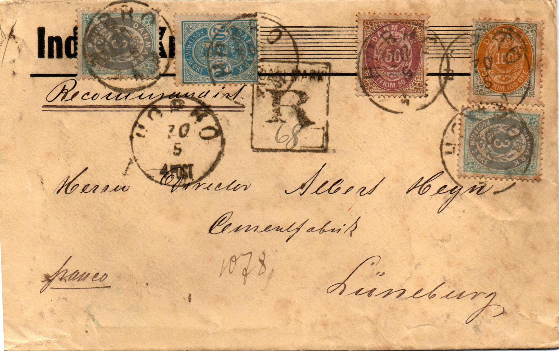 Lapidarstempel "Hobro 30.5. 4. Post", dänischer R-Stempel mit handschriftlich eingesetzter Nummer "68". Die deutsche Einschreibenummer "1078" unten. Rückseitig Ankunftstempel "Lüneburg b 31.5.92 10-11V" Absender war die Zementfabrik Cimbria, Empfänger die Cementfabrik Heyn in Lüneburg.