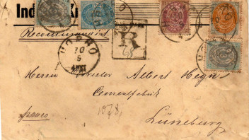 Es handelt sich um einen eingeschriebenen Brief der 8. Gewichtsstufe aus Hobro nach Lüneburg in Deutschland aus dem Jahr 1892. 8 x 20 Öre Briefporto (je 15g Gewicht) plus 16 Öre Einschreibegebühr = 176 Öre.