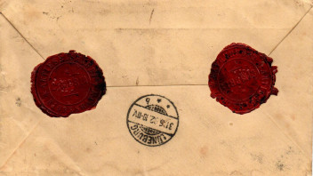 Hier also 40 Öre plus 16 Öre plus 8 Öre = 64 Öre. Frankiert wurde der Wertbrief mit je einer 10 Öre Wappentype-Ausgabe und 50 Öre der Zweifarbigen Ziffernausgabe auf der Briefvorderseite sowie einer 4 Öre Marke der Zweifarbigen Ziffernausgabe auf der Rückseite, alle Ausgabe 1895.