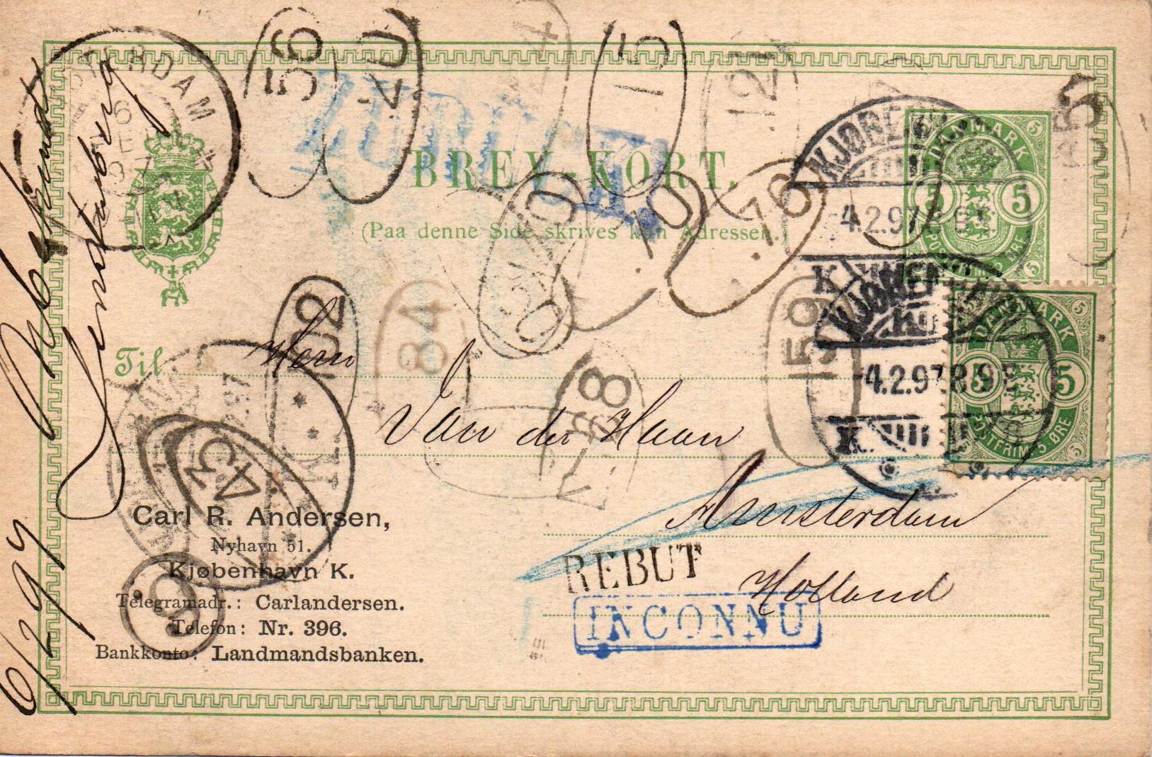 Am 4.2.97 in Kopenhagen K abgestempelt (Stempelzusatz KB = Kassebrev, also aus dem Briefkasten). Ankunftstempel Amsterdam 6. FEB. 1897. Und dann beginnt die Odyssee, Ich zähle 15 holländische ovale Briefträgerstempel plus einen kleinen Kreisstempel "6." Offenbar hat jeder Briefträger Amsterdams die Karte in der Hand gehabt aber keine konnte mit dem Empfängernamen Van der Haan etwas anfangen. Also unbekannt zurück. Linienstempel "Zurück" und "Rebut" sowie Rahmenstempel "Inconnu" Wenn ich den zweiten Kopenhagener Stempel richtig entziffert habe dann war die Karte am 12.2.1897 wieder in Kopenhagen.