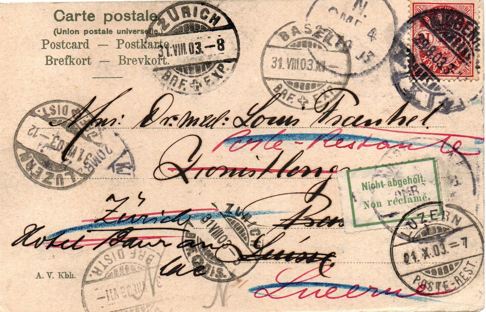 Abgeschickt in Kopenhagen K am 29.8.1903, Am 31.VIII 03 -5 in Zürich BRF. DIS" angekommen, Umadressiert nach Luzern, Poste restante. Abgegangen von Zürich 31. VIII . 03. -8 BRF EXP. Offenbar über Basel geleitet: 31. VIII 03 XI BRF. EXP. Angekommen in Luzern 31.VIII 03. -12 BRF. DIST., Klebezettel: "Nicht abgeholt / Non réclamé" In Luzern abgegangen: 21.X.03 =7 POSTE-REST. In Kopenhagen angekommen N OMB. 4 27.10.03.