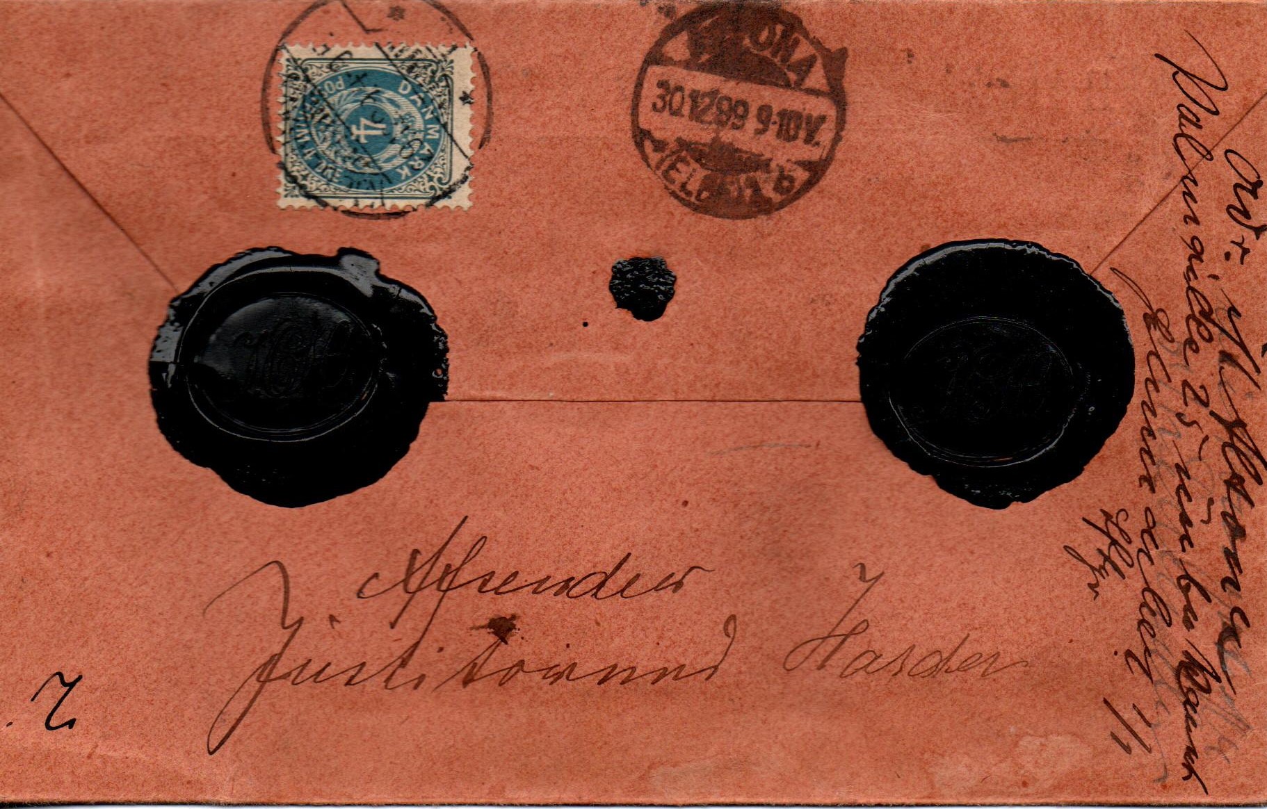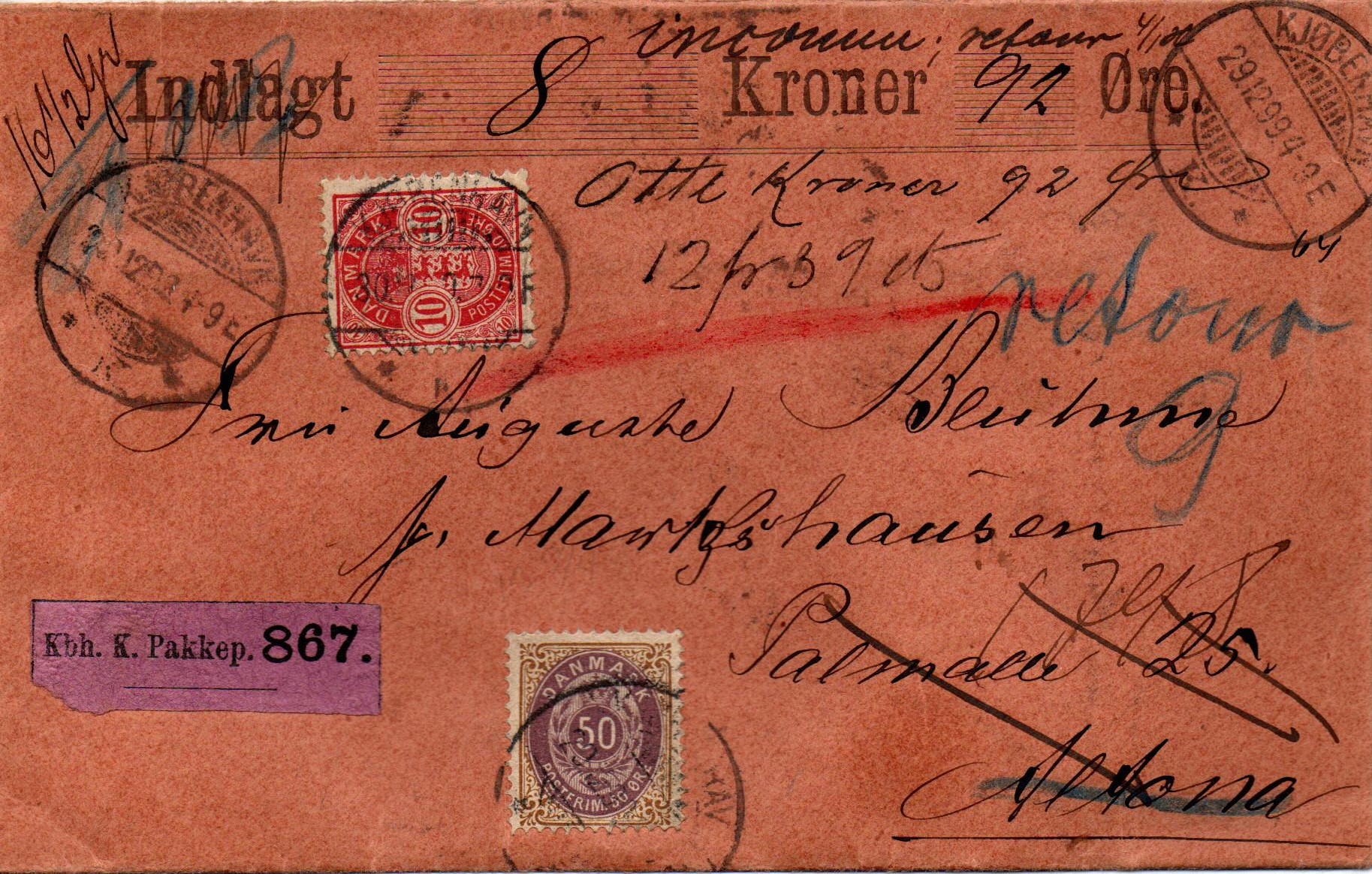 Es handelt sich um einen Wertbrief über 8,92 Kronen (umgerechnet in 12 frcs 9 cts) aus Kopenhagen nach Altona, Palmaille 25 aus dem Jahr 1899. Dort unbekannt, siehe handschriftliche Vermerke ganz oben und auf der Rückseite und retour.