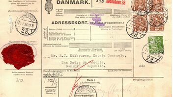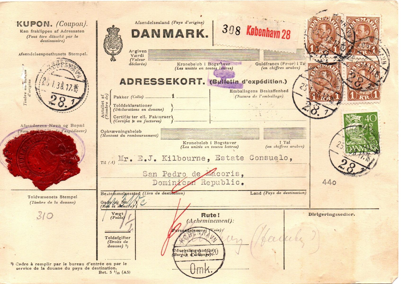 Ein Paket mit anderthalb Pfund Gewicht der Kongelig Porcelainsfabrik København (Siegel auf der Vorder- und Firmenstempel auf der Rückseite) in die Dominikanische Republik aus dem Jahr 1938. Leitvermerk via Hamburg, Transitstempel Hamburg auf der Rückseite. Wie einleitend geschrieben sind die 1 Kr. Marken oben links und unten rechts beschädigt