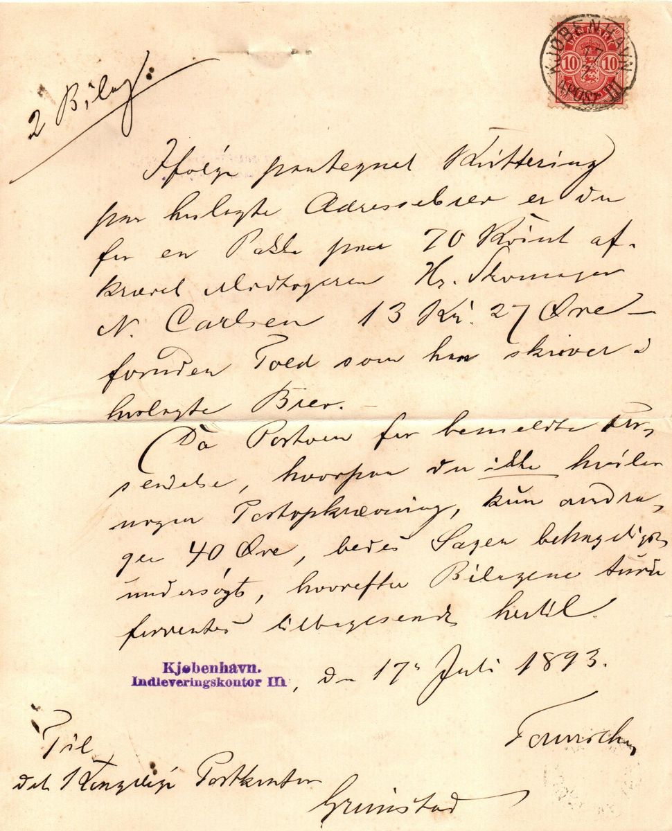 Auf jeden Fall handelt es sich um ein Schreiben des Kjøbenhavn Indleveringskontor III an das königliche Postamt in Grimstad (Norwegen, Südküste zwischen Kristiansand und Arendal). Es geht um eine Paketkarte (Adressebrev) für ein Paket das nicht nur mit Zoll belegt wurde sondern anscheinend auch ein Nachnahmepaket über 13 Kronen und 27 Øre war.
