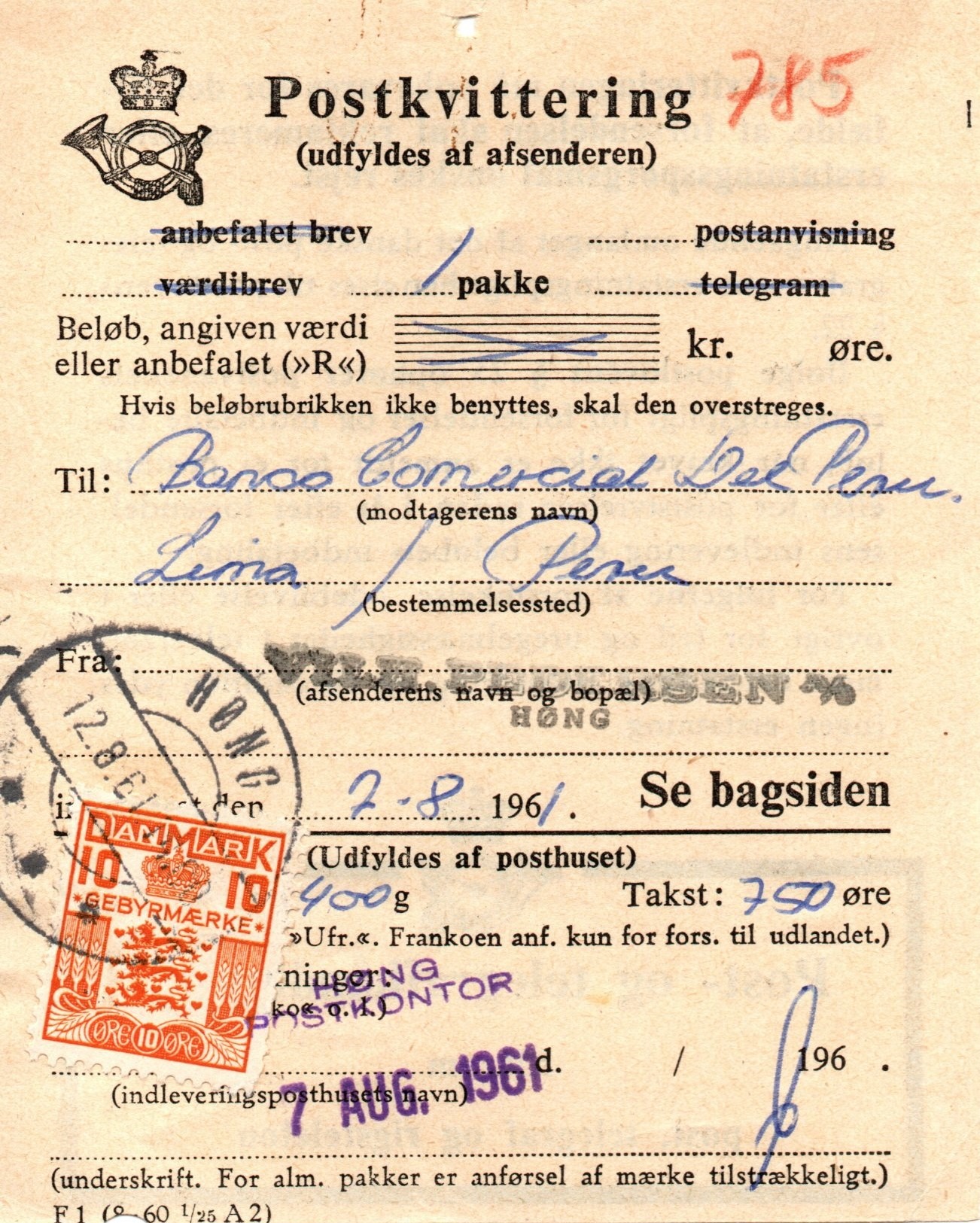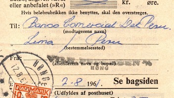 Genau so war es bei dieser kürzlich erworbenen Postkvittering aus dem Jahr 1961. Auch sie mit einer 10 Öre Gebührenmarke "frankiert" weil der Einlieferungsschein offenbar nicht vom Absender vollständig ausgefüllt vorgelegt wurde. Diesmal gab Peru als Destination für das eingelieferte Paket den Aussschlag zum Kauf.
