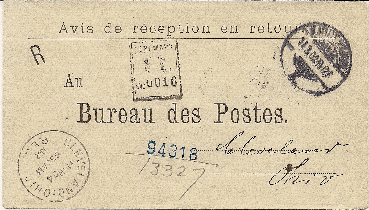 Ich zeige hier mal ein eingeschriebenes Postsachenkuvert für einen Rückschein, der vom Brevpostkontoret in Kopenhagen nach Cleveland/Ohio geschickt wurde. Auf dem Kuvert findet sich vorgedruckt ein Hinweis auf den Inhalt: Avis de Reception en retour