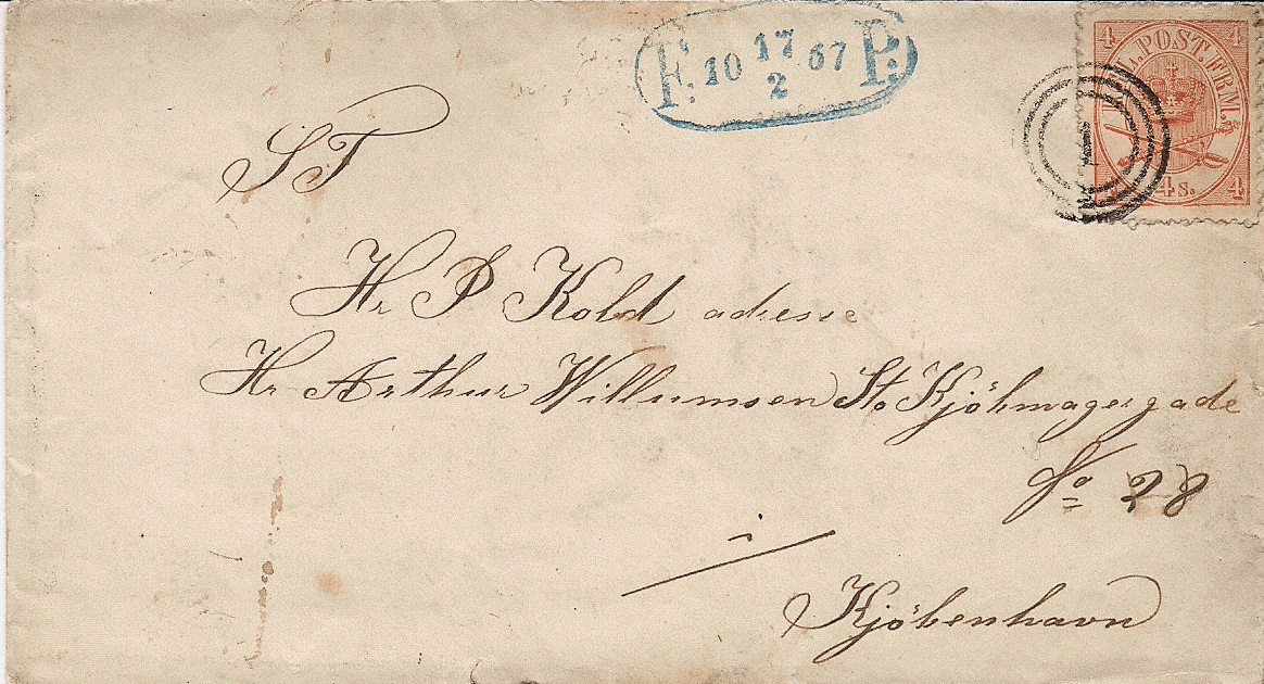 Es handelt sich um einen mit einer 4 Skilling Marke der Ausgabe 1864 frankierten Fusspostbrief an Herrn P. Kold, Adresse: Arthur Willumsen, Kjøbmagergade no. 28, Kjøbenhavn.