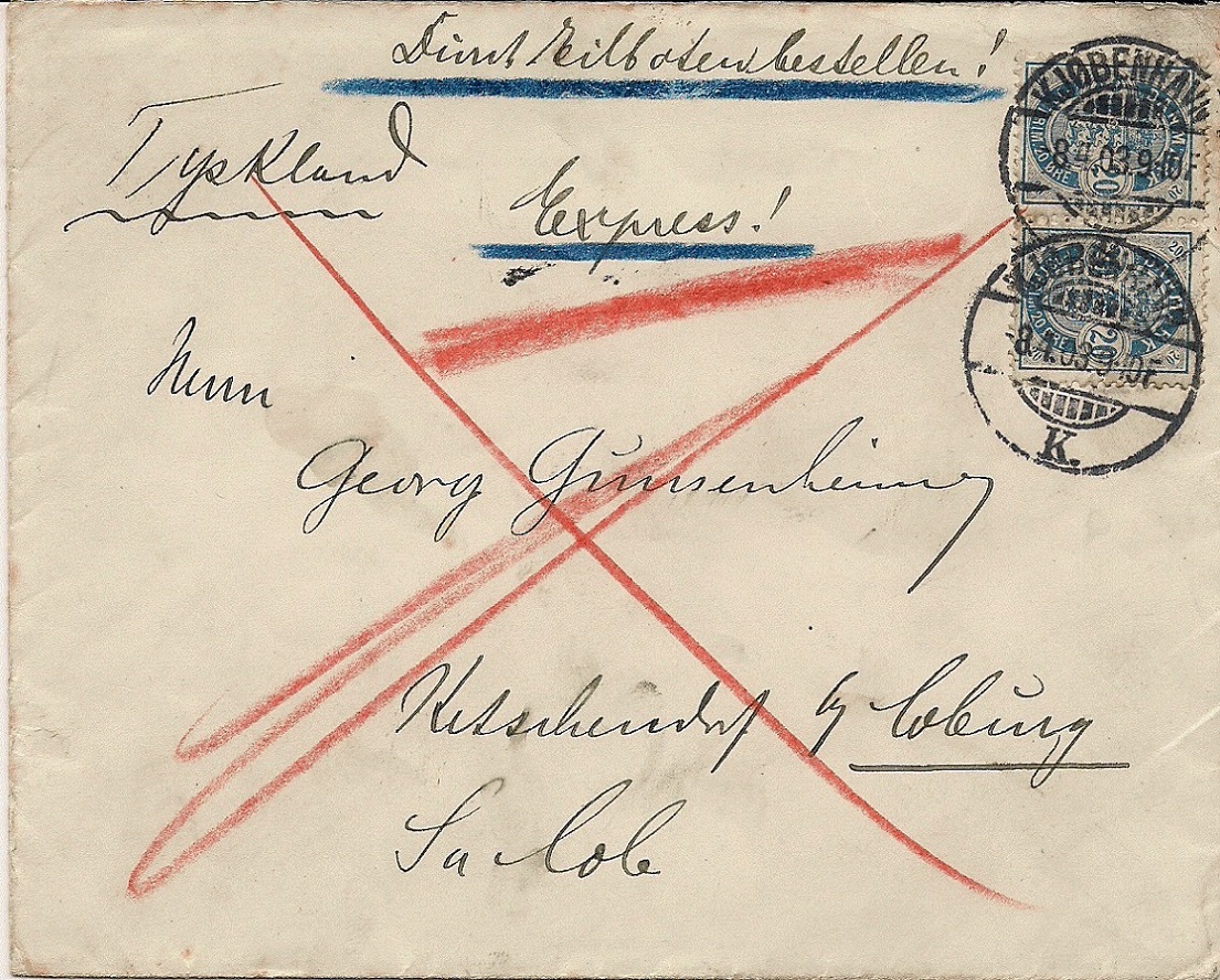 Hier zeige ich einen Expressbrief aus Kopenhagen nach Ketschendorf bei Coburg (damals noch Sachsen-Coburg, Thüringen). Frankiert mit einem Paar der 20 Öre Marke der Våbentype-Ausgabe 1895, 20 Øre Auslandsbriefporto und 20 Øre Expressgebühr.