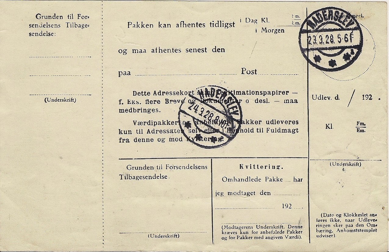 Rückseitig sehen wir zwei Brotype-Stempel des Postamts Haderslev vom 23.3.28 und 24.3.28. Am 23.3.28 wurde die Paketkarte zugestellt, vorderseitig hatte das Postamt in Haderslev den L3-Stempel "Forsendelsen er oplagt paa Had....". Am 24.3.28 wurde das Paket offenbar abgeholt und der Tausch Paketkarte gegen Paket mit dem genannten Tagesstempel quittiert.