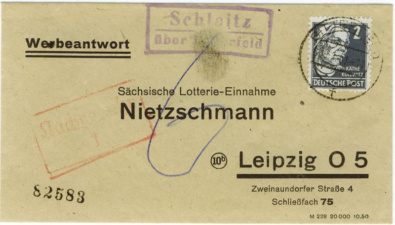 Nun gibt es aber Zeitgenossen, damals wie heute, die das entweder nicht begreifen und unschlüssig sind ob nun mit oder ohne Marke zurückzusenden ist. Also pappt man anstandshalber wenigstens irgendwas drauf. In diesem Fall eine 2Pf. Marke.