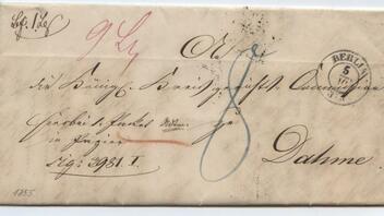 ich hab da einen wunderschönen Brief bekommen der von Berlin nach Dahme lief und nachportiert wurde wenn ich das richtig deute mit 8 Sgr.