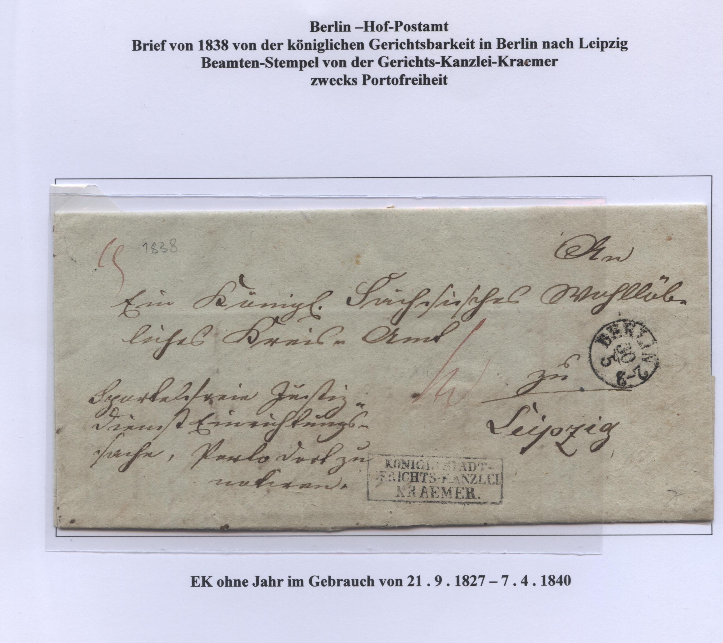 leider kann ich den Vermerk links unten nicht genau entziffern. Da der Brief von Berlin (KammerGericht) "An ein Königl(iches ) sächsisches? wohllöbliches Kreis Amt zu Leipzig" (Sachsen) lief, wäre es schön zu wissen.