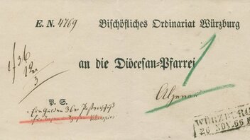 Vordruckbrief (-hülle) des “Bischöfliches Ordinariat Würzburg” vom 26. Nov. 1866 - P.S. (Parteisache = Gebührenpflichtig). Mittels Postvorschuss erhob das Ordinariat Würzburg bei der Diözesan-Pfarrei Alzenau (z.B. für das Ausstellen einer Heiratsgenehmigung) einen Betrag von 1 Gulden und 36 Kr. Incl. Porto 12 Kr. und Scheingebühr 3 Kr.