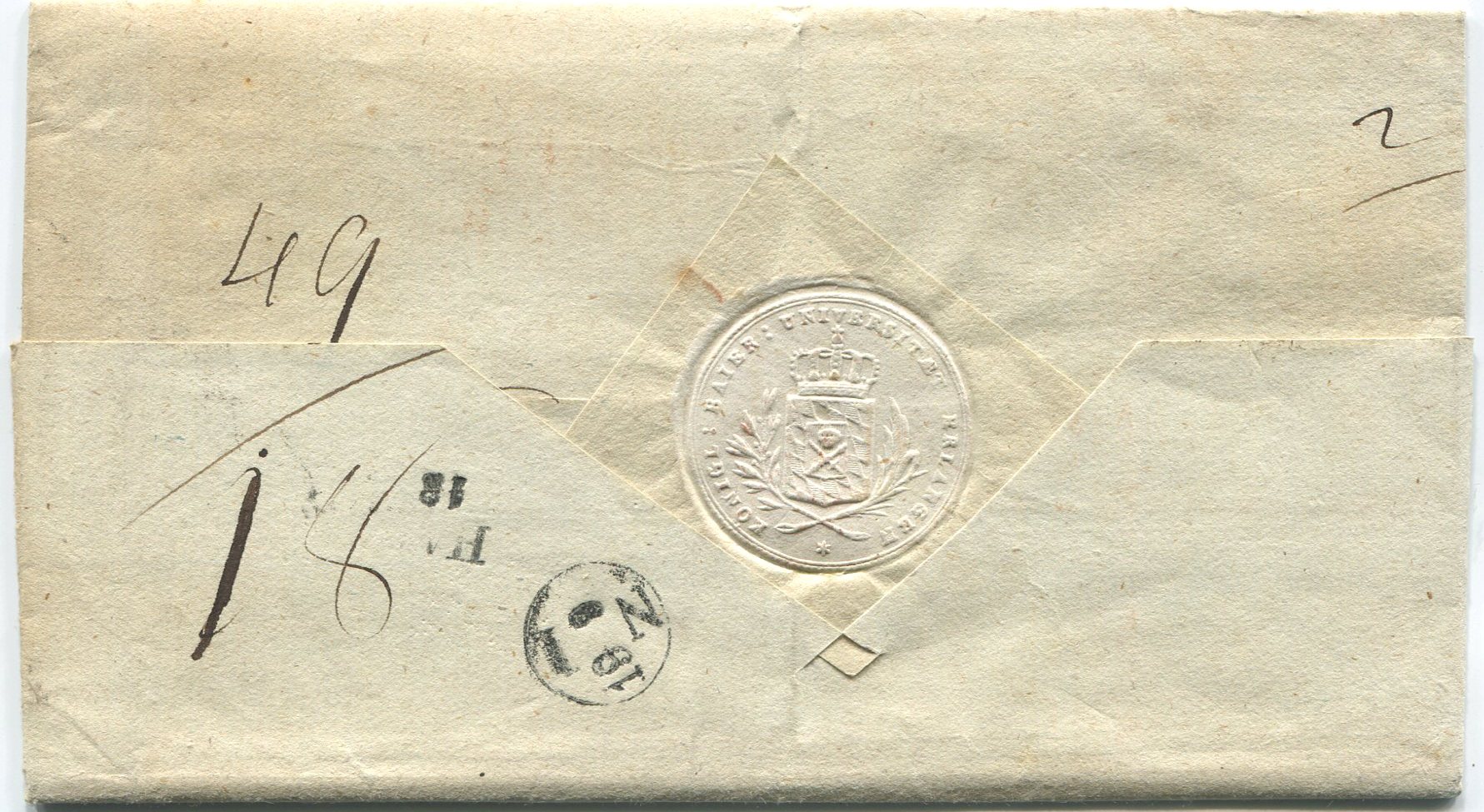 Als Grenztaxpunkt fungierte Aschaffenburg, so dass man die knapp 13 Meilen von da bis Rothenburg ob der Tauber für einen Brief in der 4. Gewichtsstufe (6 + 3 + 3 + 3 = 15 Kr.) mit über 1 1/2 bis 2 Loth annehmen darf (die später notierten 20 Kr. passen in kein Schema, denn über 18 bis 24 Meilen lag Rothenburg nicht von Aschaffenburg entfernt).