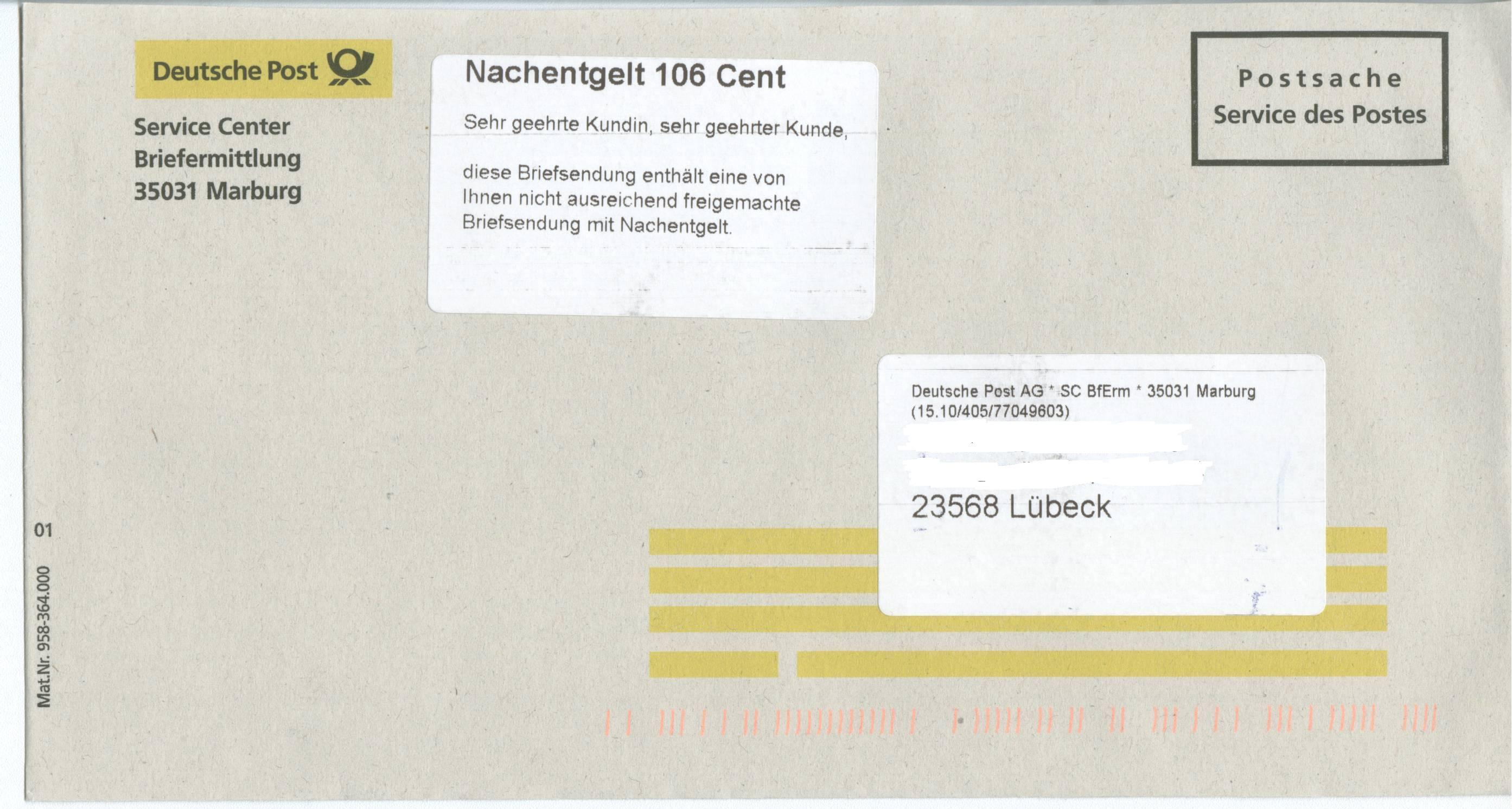 Heute durfte ich doch tatsächlich zum ersten mal in meinem Leben ein Nachentgeld entrichten! Ich erhielt eine unfrei gemachte Sendung einer bekannten Stiftung und durfe das fehlende Porto in Höhe von 1,96 € bezahlen.