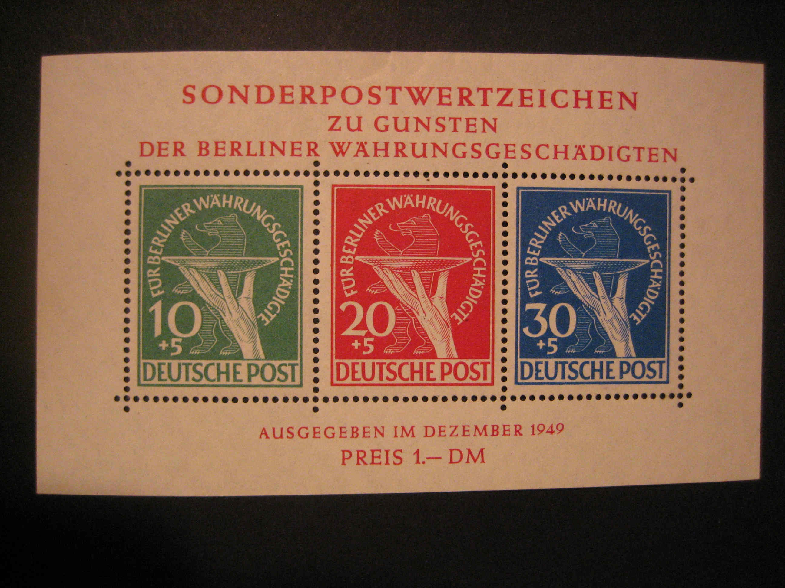 tröste Dich damit, dass der Berliner Währungsgeschädigten-Block ** ja nicht so wahnsinnig hoch bewertet wird wie sauber gestempelt. Wahrscheinlich hat der Vorbesitzer dafür einen moderaten Preis bezahlt, denn als der Block geprüft wurde, war er auch schon nicht mehr einwandfrei (erhöht signiert).