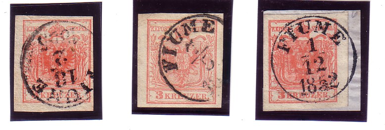 Die Marke links wurde am 5.8.1855, die IIIb (rechts) am 6.11.1856 abgestempelt. Dem Abschlag zufolge offensichtlich vom selben Postmeister. Hat noch jemand derartig ähnlich platzierte Fiume-Stempel?