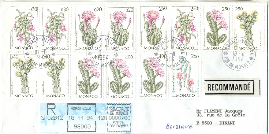R-Brief von Monaco nach Belgien vom 18.11.1994 mit verschiedenen Kakteenmarken.