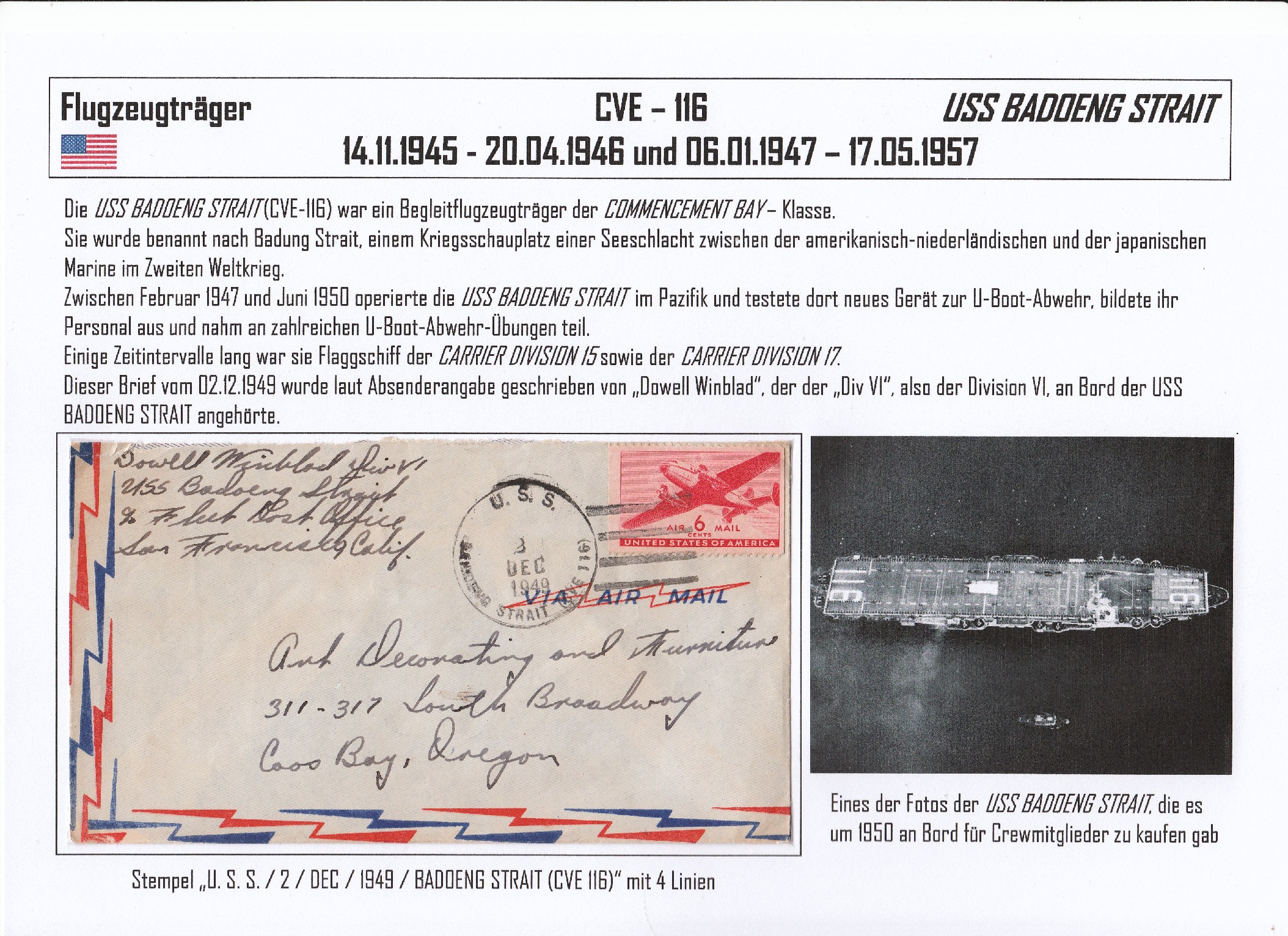 Dieser hübsche Bedarfsbeleg stammt von einem Crewmitglied des Begleitflugzeugträgers USS BADOENG STRAIT (CVE-116).