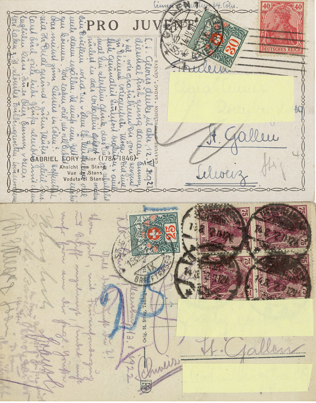 Die Schweizer Portomarken sind gestempelt mit: St. Gallen - Briefträger. Die Karten waren wohl unterfrankiert vom deutschen Absender, und der Briefträger hat vom Schweizer Empfänger das Nachporto in bar erhalten und als Quittung die Portomarken auf die Karte geklebt und mit einem eigenen Briefträger-Stempel entwertet.