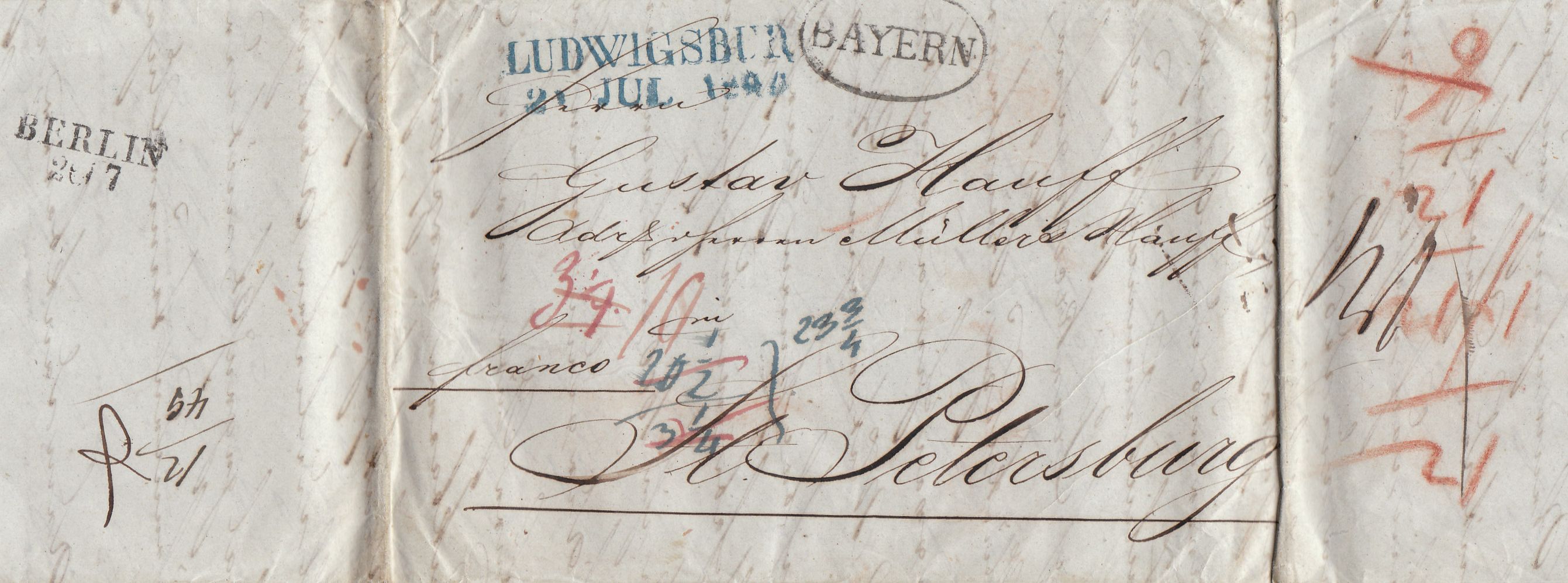 Nach dem Postvertrag zwischen Preußen und Russland von 1843 hätte das preußische Transitporto für einen einfachen Brief bis 1 Loth aus Württemberg 8 Sgr. (28 Kr.) betragen. Bis 1 1/2 Loth wären 12 Sgr. oder 42 Kr. fällig gewesen. 72 Kr. hätten für einen Brief von 2 bis 2 1/2 Loth gereicht.