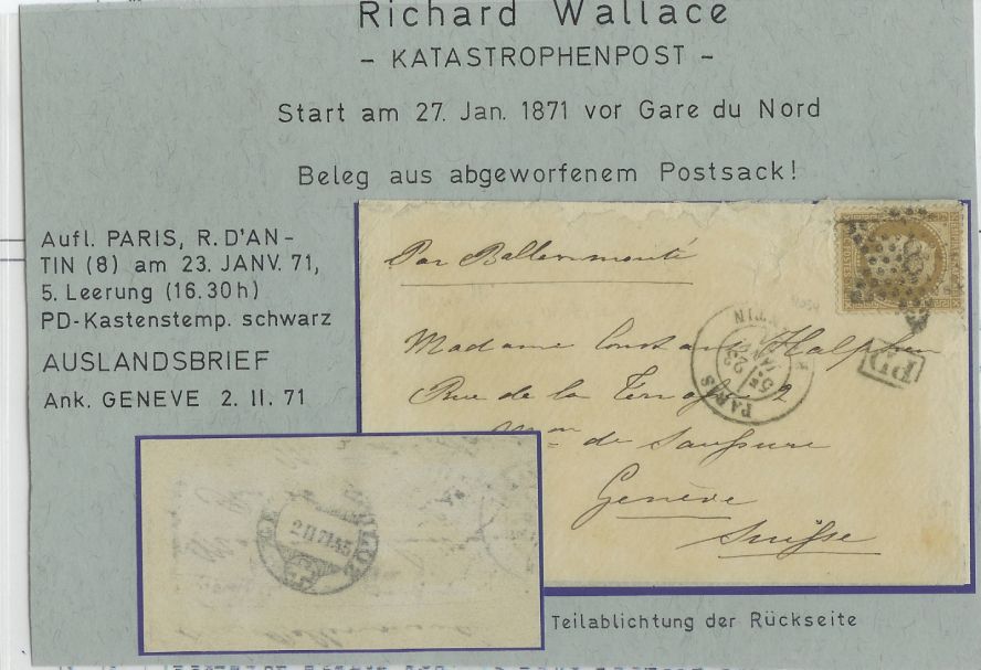 Der erwähnte Beleg wäre sicher das Sahnestückchen in meiner Sammlung,ich kann aber auch 2 interessante Auslands-Destinationen der"Ballon monte"-Briefe aus meiner Sammlung zeigen,die jeweils einen 4-stelligen Eurobetrag kosten dürften: