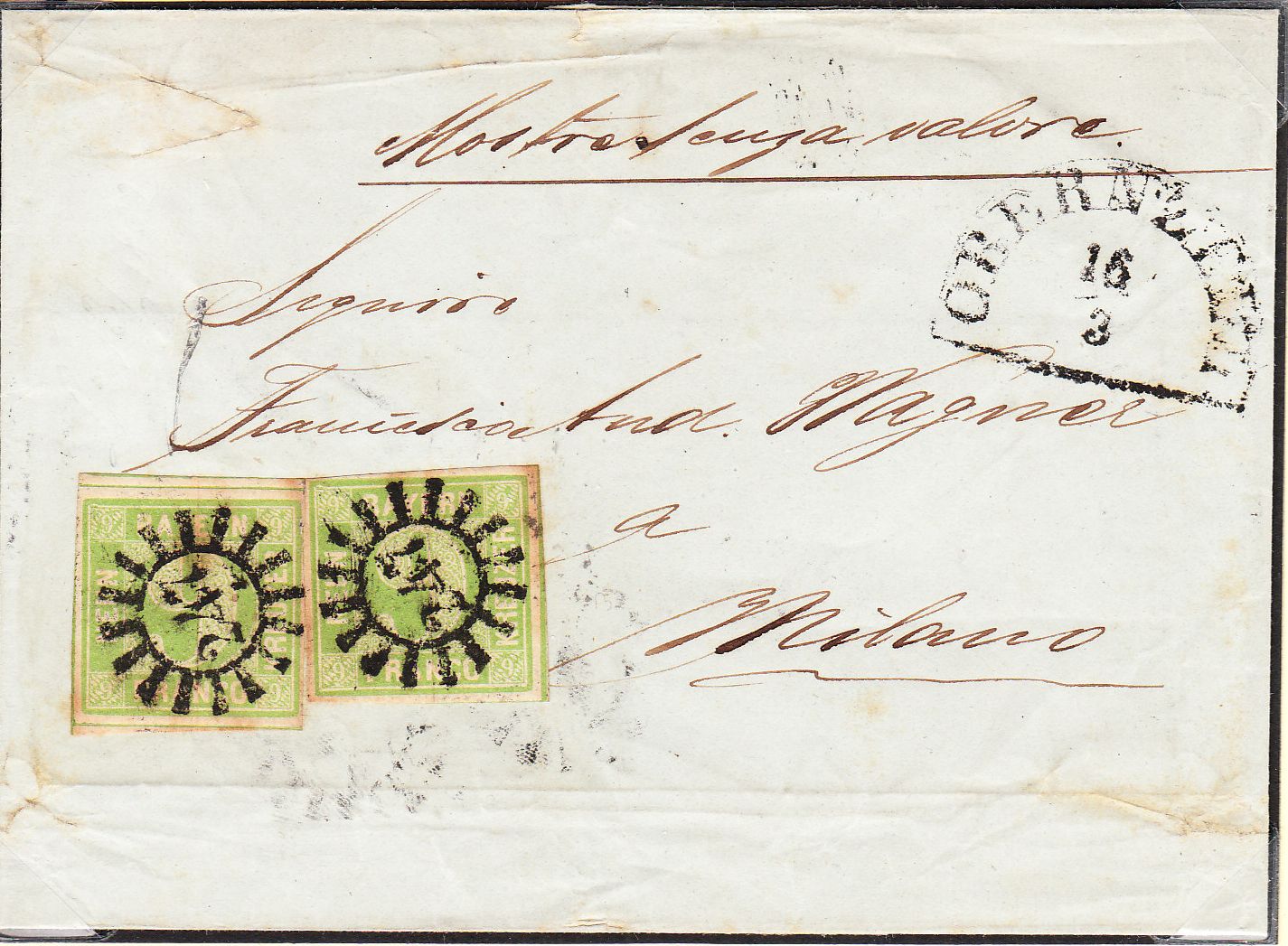 3) 1852 von Obernzenn nach Mailand als 4. Gewichtsstufe mit 18 Kr. frankiert, weil ein Muster ohne Wert anhing und somit je 2 Loth nur eine Gewichtsstufe berechnet wurde. Tatsächliches Gewicht war aber zwischen 2 und 4 Loth.