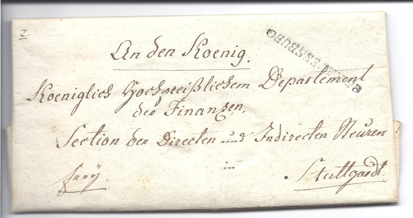 nachdem ich in anderen Threads gerade so viele Fragen stelle, mal wieder ein Stück "nur zum Vorstellen". Brief von Ravensburg nach Stuttgart, Entfernung zwischen 12 und 18 Meilen, doppeltes Gewicht (1 bis 1 1/2 Loth).