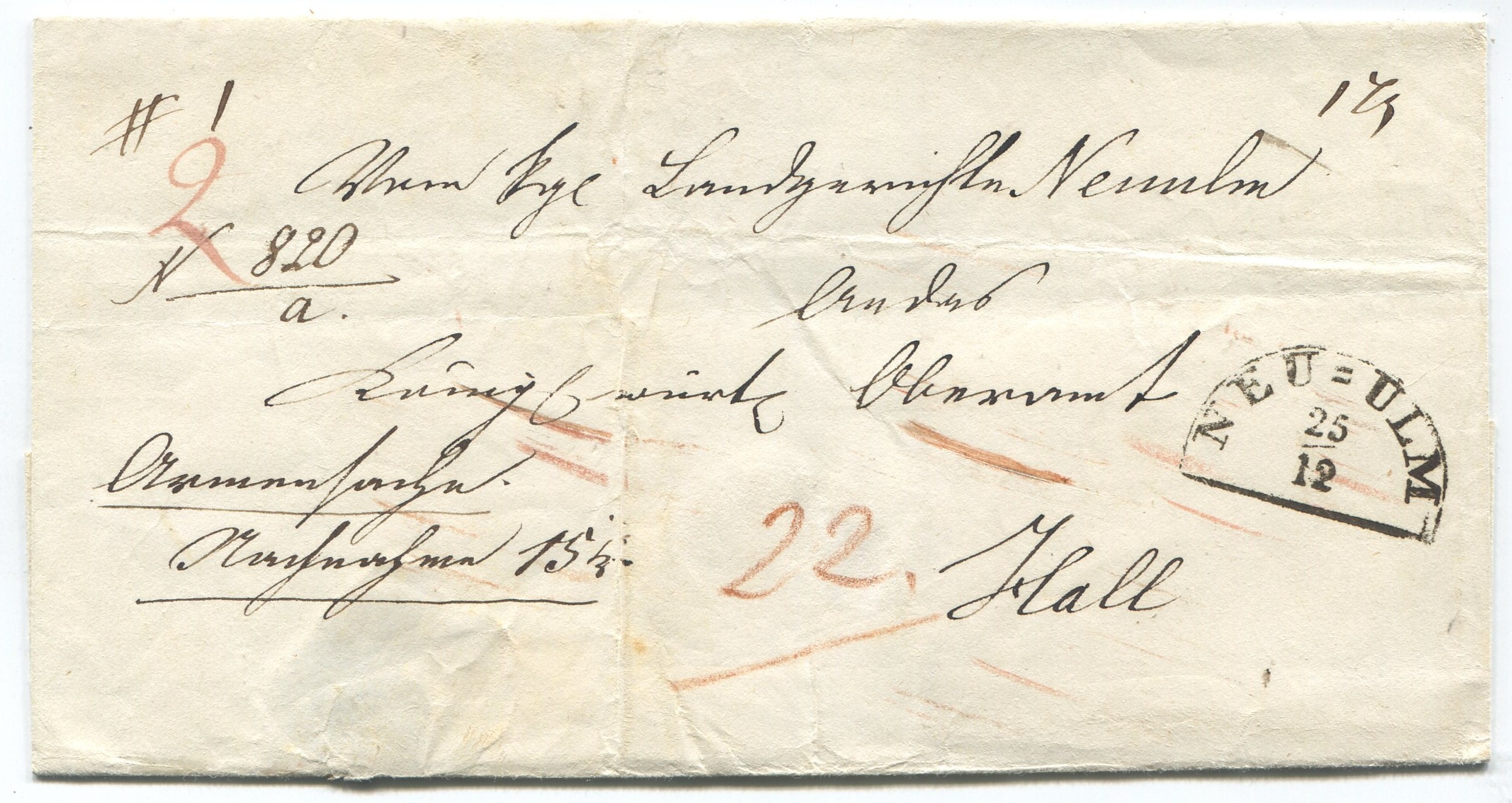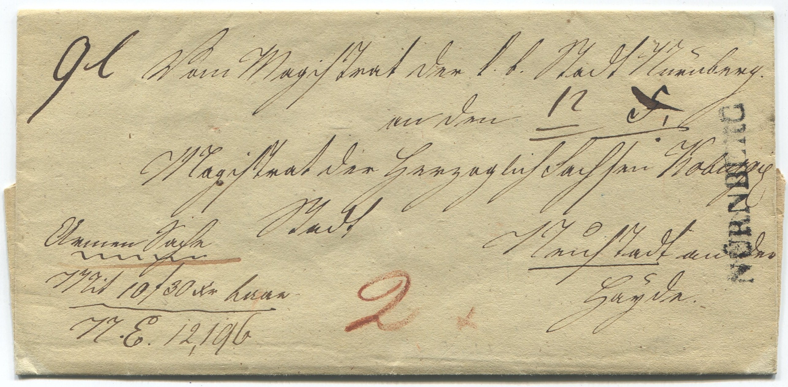 Ein Musterbeispiel einer perfekten AS zeige ich vom 9.2.1857 aus Amberg. Sie wurde an einen königlichen Advocaten, Herrn Doctor Hartmann in Würzburg, gerichtet und besteht aus einem Kuvert (ganz unüblich, 99% der AS waren Faltbriefe).