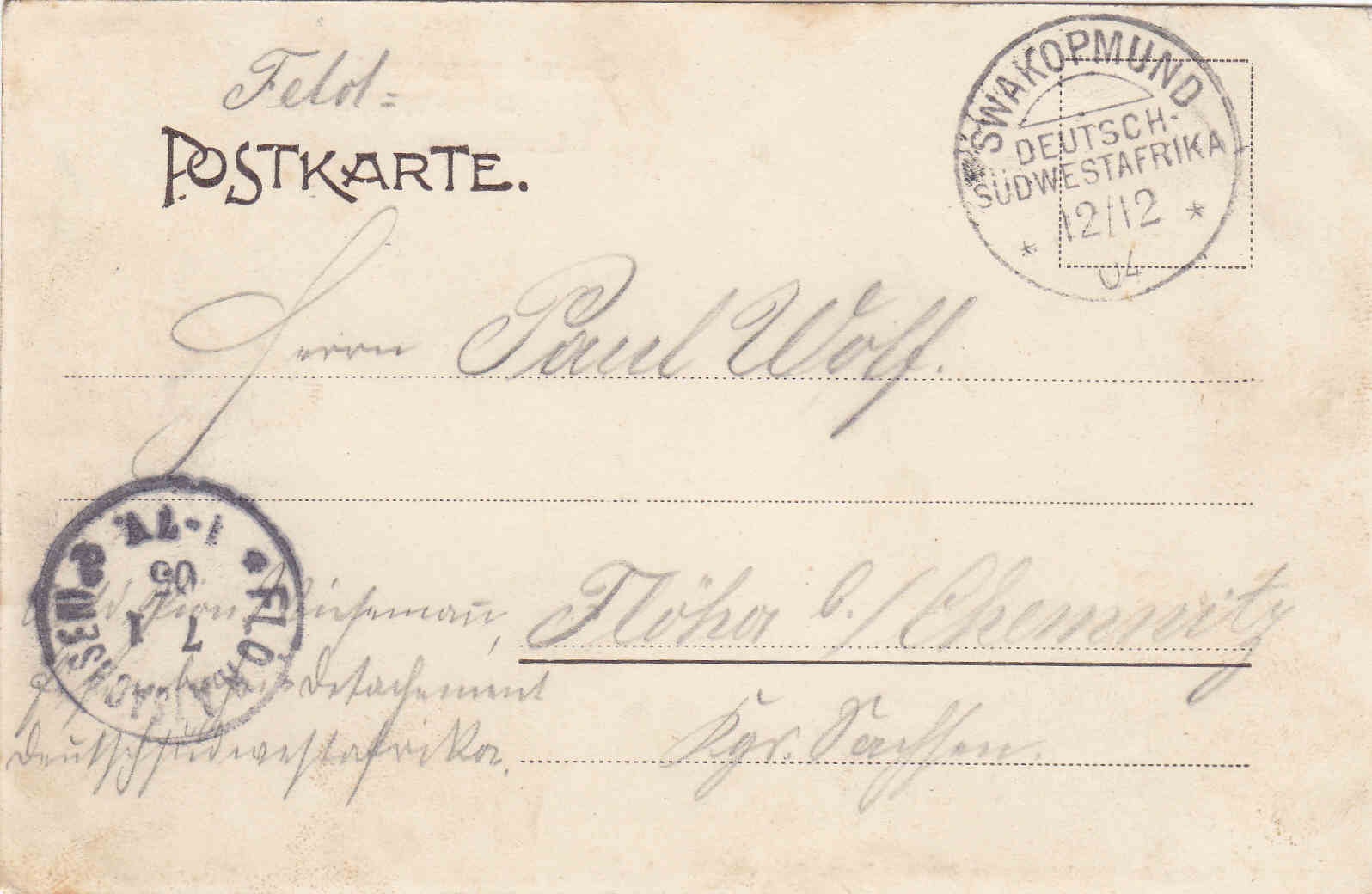 Weiter geht es mit der DSWA Ansicht "Leuchtturm" Swakopmund, gelaufen als Feldpostkarte von Swakopmund, 12 / 12 (19)04 nach Flöha, Ank.St. v. 7 1 (19)05 und dazu noch eine Namibia Karte mit Abbildungen historischer Gebäude in Swakopmund...
