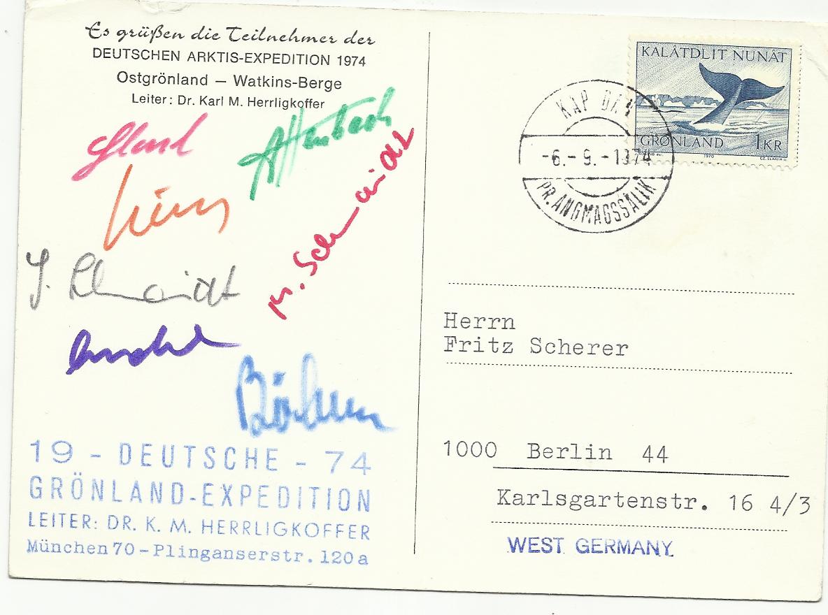 Ich zeige hier eine Karte der 1. Deutschen Arktisexpedition zum Nordpol, die allerdings, wie ein Stempel belegt, "mangels dänischer Unterstützung" nicht wie geplant autonom, sondern zusammen mit der Staunigsalbengruppe stattfinden konnte. Die zwei anderen Karten - eine hatte ich schon im Hundesthreat präsentiert, stammen von der 19. Deutschen Grönlandexpedition von 1974.