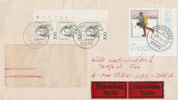 Frankiert mit 1* 100 Pf Giehse (1390) + 1* 200 Pf Suttner (1498) + 2* 300 Pf Hensel (1433)