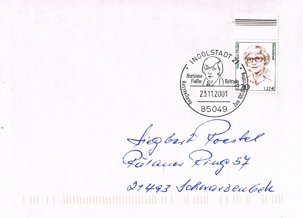 Zum 100. Geburtstag war Marieluise Fleißer ihrer Heimatstadt Ingolstadt einen Sonderstempel wert. Marieluise Fleißer (* 23. November 1901 in Ingolstadt; † 2. Februar 1974 ebenda) war eine deutsche Schriftstellerin, welche die Neue Sachlichkeit vertrat.