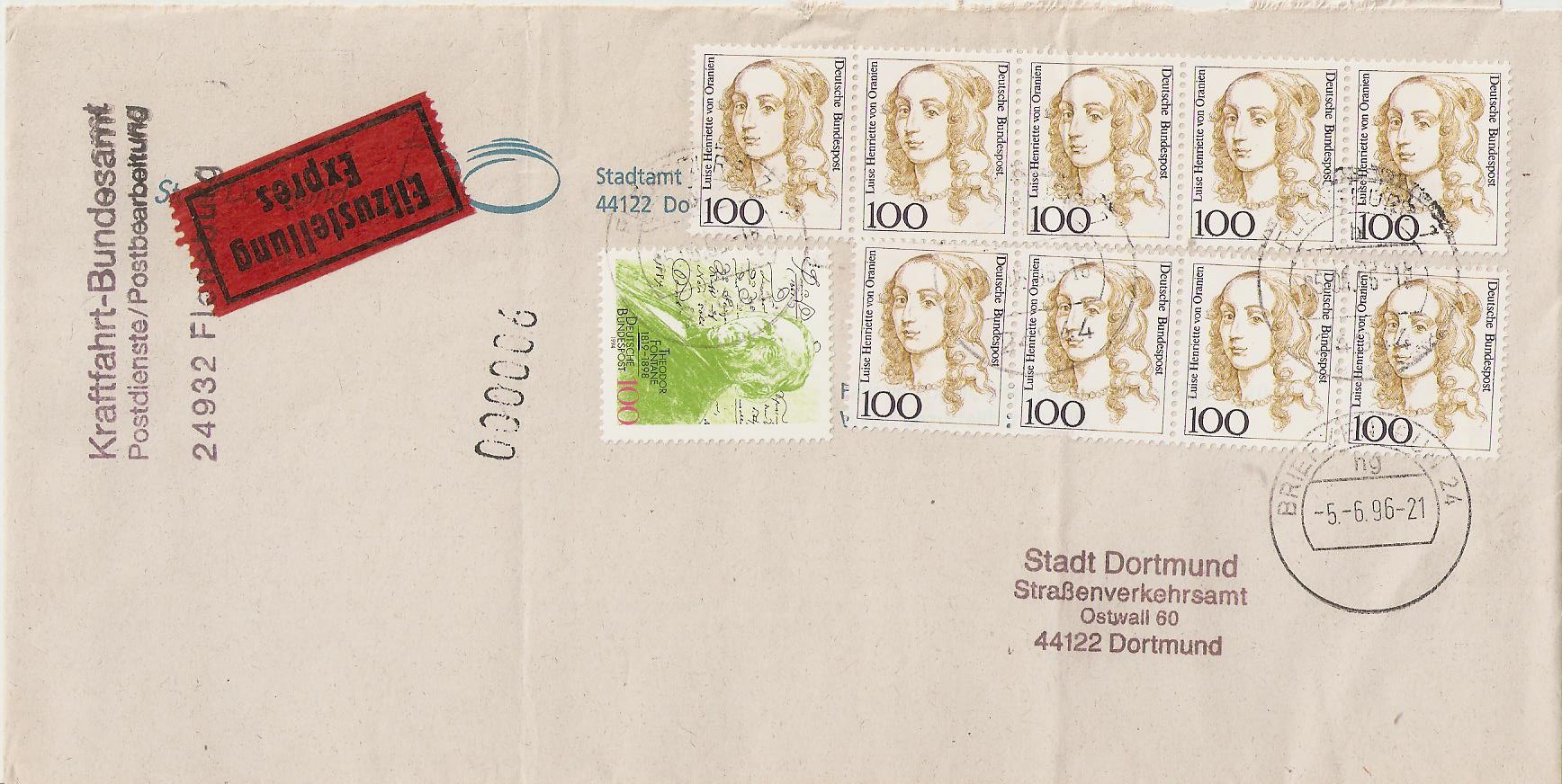 Frankiert mit 1* 100 Pf SWK (1406) + 10* 100 Pf von Oranien (1756)