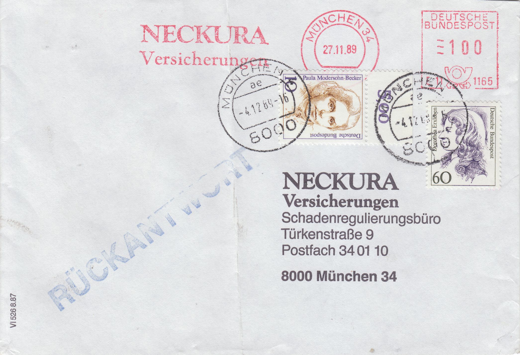 Dieser Umschlag wurde für die "RÜCKANTWORT" vom Absender am 27.11.1989 per Absenderfreistempel der Wertstufe 100 Pfennig, der Gebühr für einen Standardbrief bis 20 Gramm entsprechend, freigemacht.
