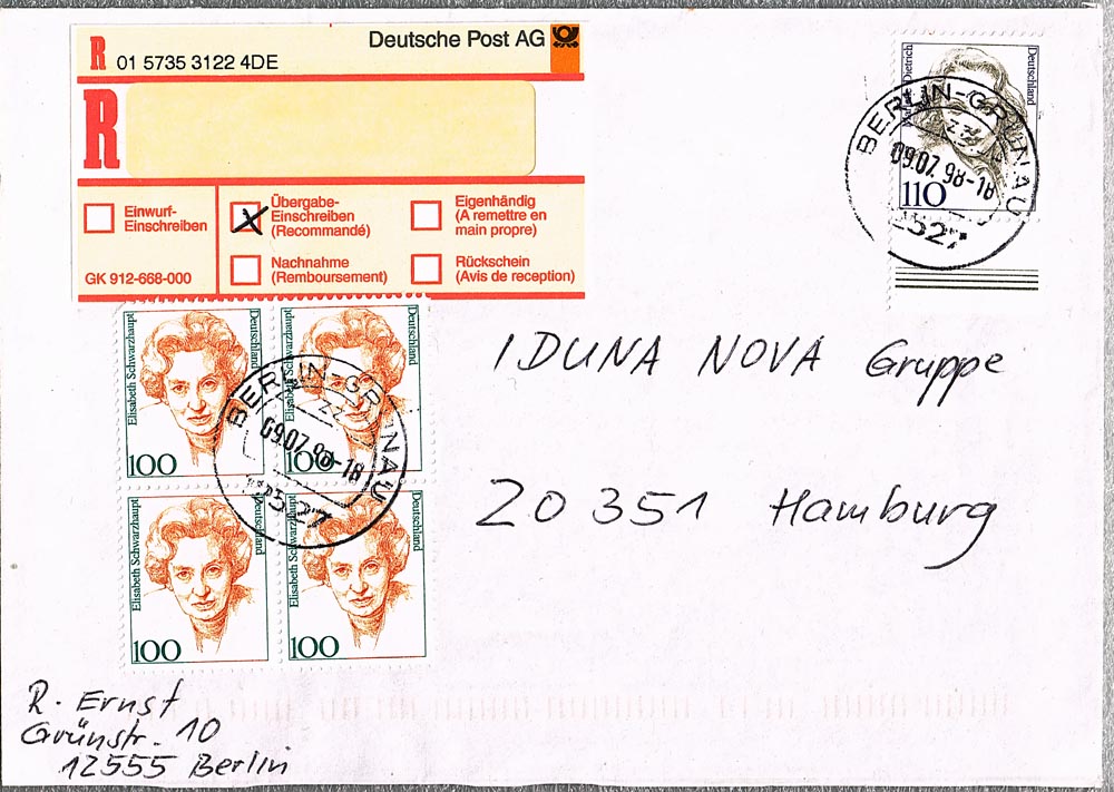 frankiert mit einem Viererblock MiNr 1955 (100). Elisabeth Schwarzhaupt hatte übrigens kürzlich ein Jubiläum als erste Frau, die ein Ministeramt der Bundesrepublik innehatte; Marlene Dietrich aus einem 10er Bogen mit Unterrand. Tagesstempel 12527 BERLIN-GRÜNAU Kb zz vom 09.02.98.