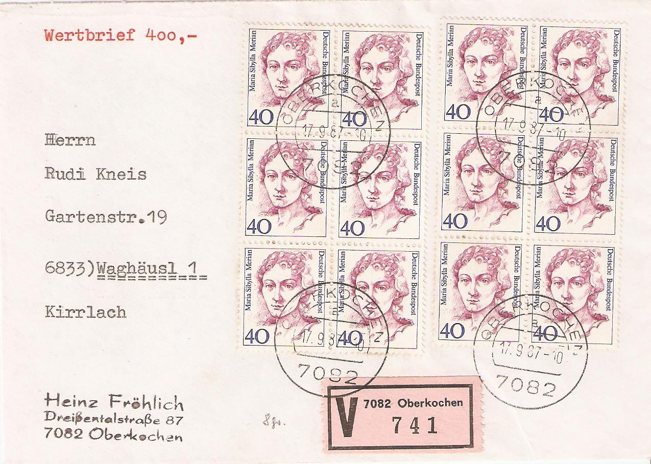 Portogerecht freigemacht mit 2* 100 Pf Schwarzhaupt (Mi-Nr 1955) & 2* 10 Pf SWK (1347) & 1* SM 400 Pf (1805) = 6,20 DM.