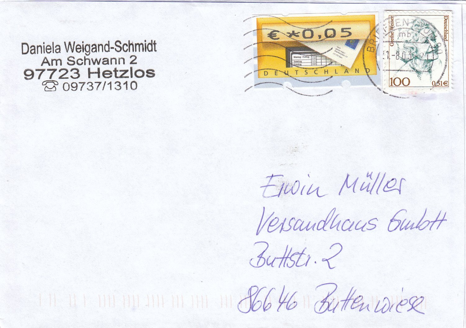 Mit dem 01.01.2003 senkte die Post aber das Porto für Standardbriefe von 0,56 € auf 0,55 €. Somit ist dieser Brief um 0,01 € überfrankiert!
