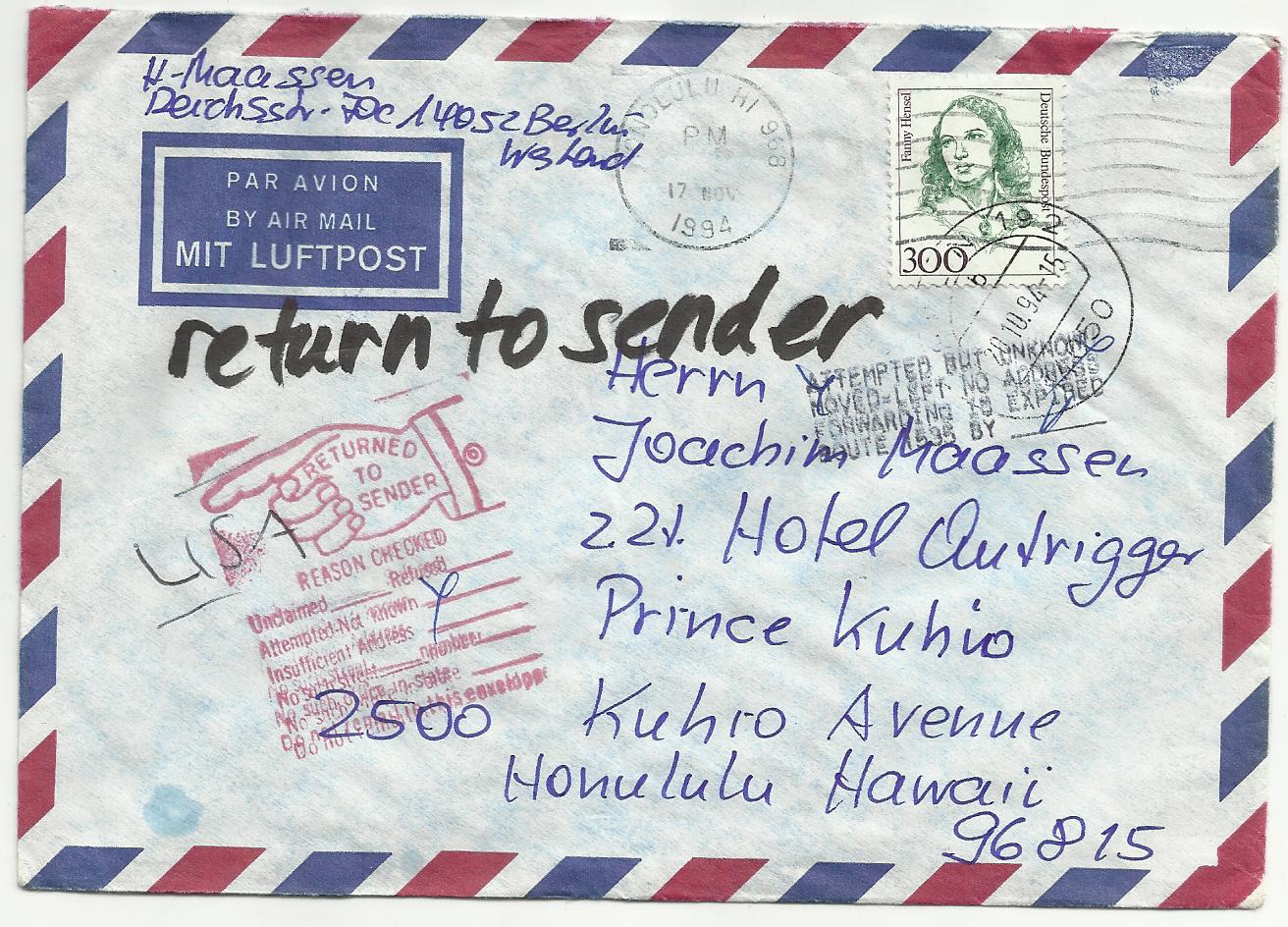Frankiert mit 2* 200 Pf von Suttner (1498) und 2* 5 Pf Ihrer (1405).