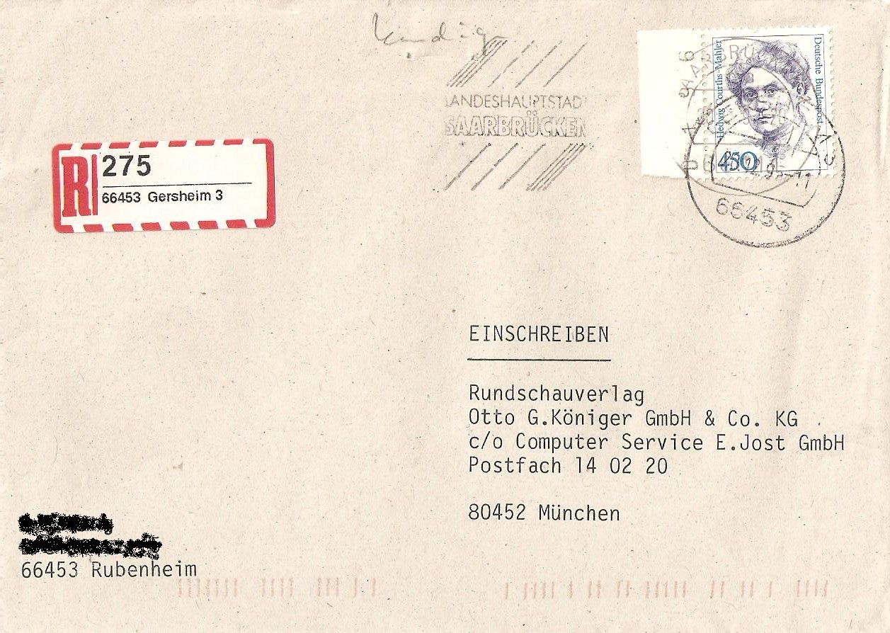 Einschreiben - freigemacht mit 1* 450 Pf Courths-Mahler (1614)