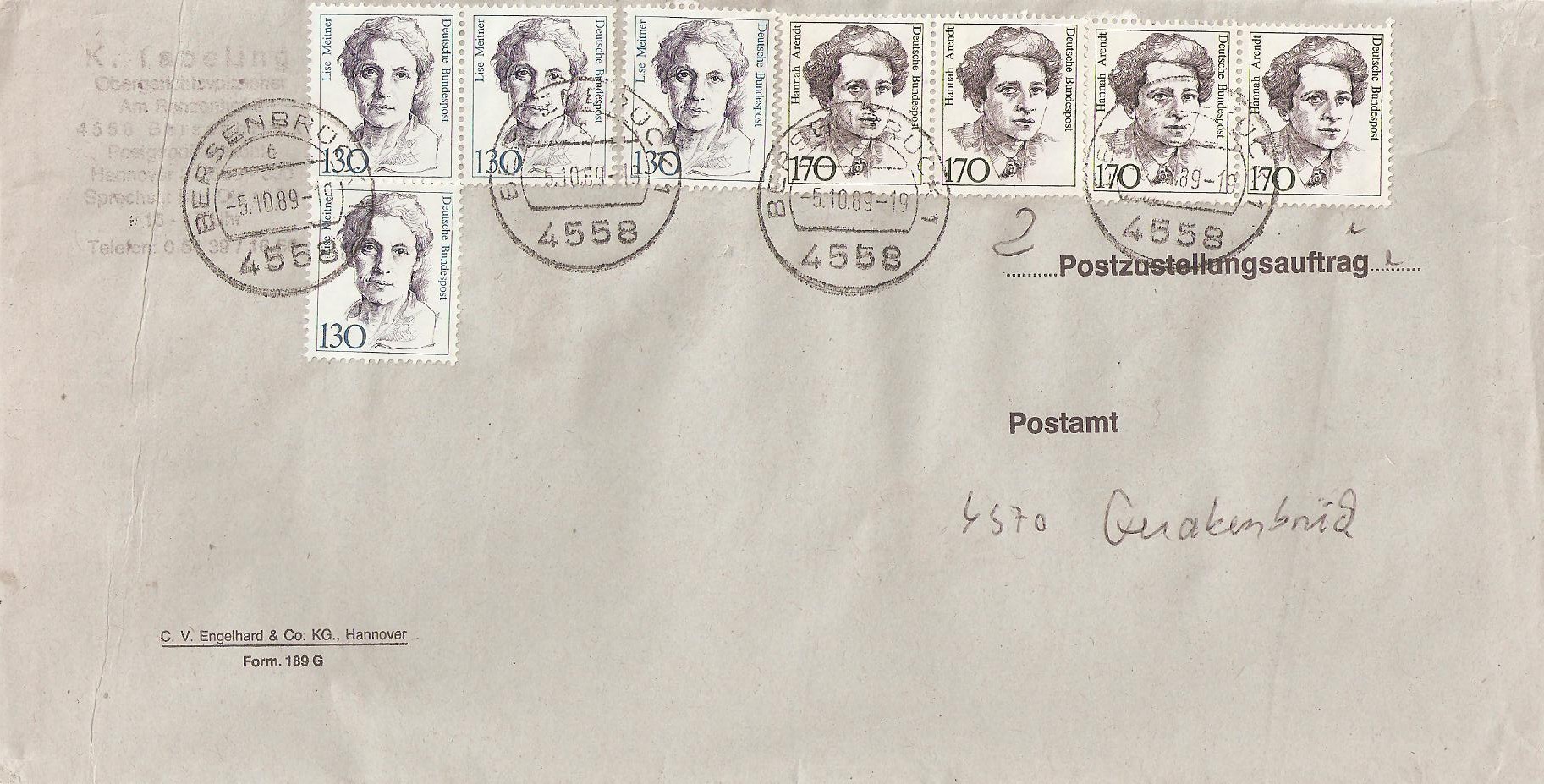 Um portogerecht frankiert zu sein, fehlt allerdings noch entweder Rückschein oder Eigenhändig als Zusatzleistung. Darüber fehlt jedoch jedweder Vermerk.