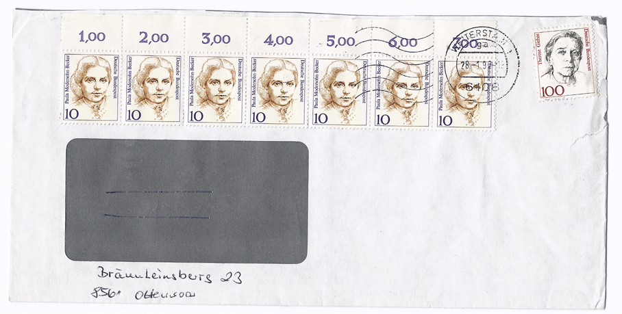 Zusatzfrankatur mit dem 30 Pf Frauenwert Kollwitz (1488).