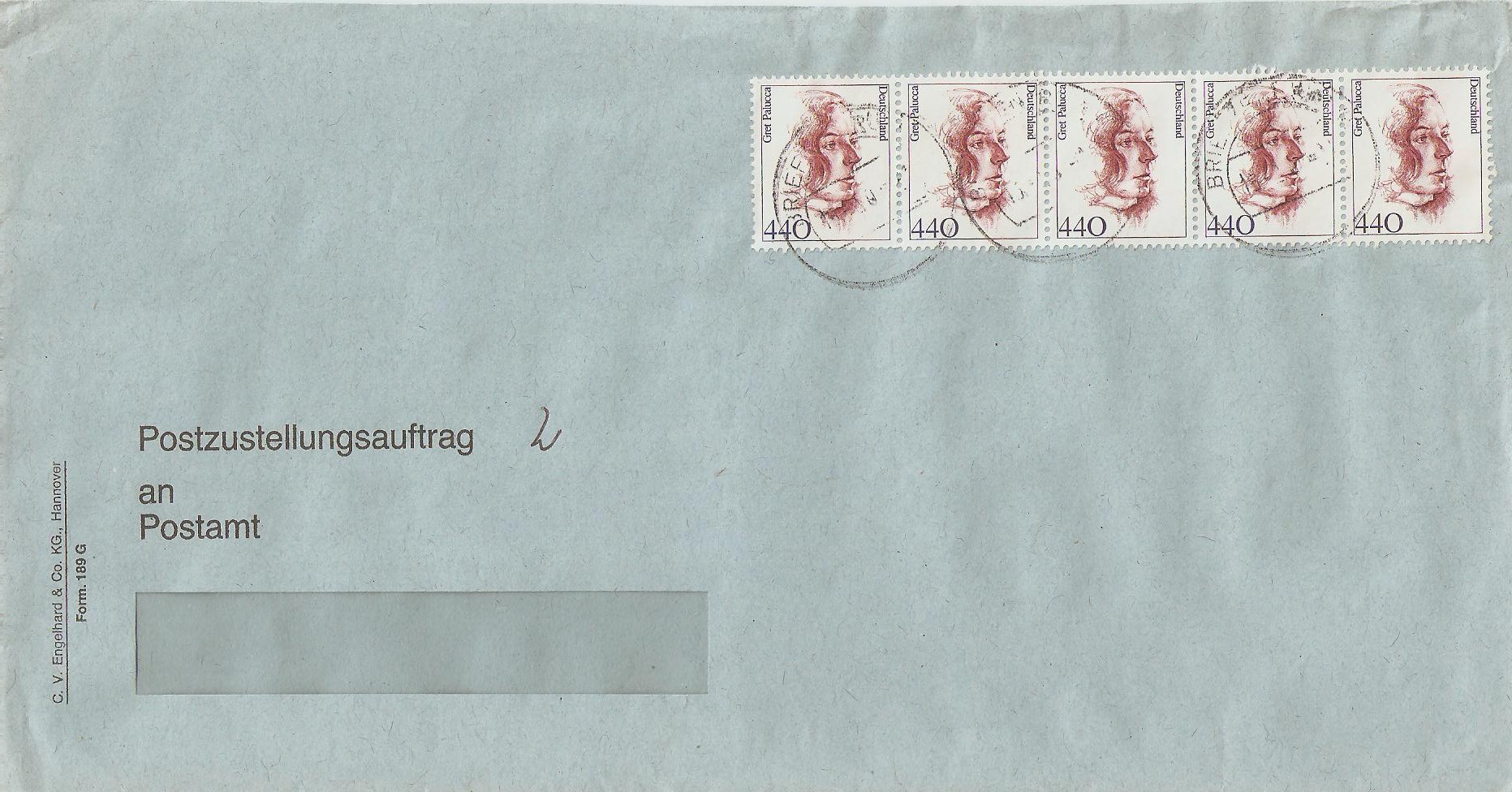 PZA Umschlag mit 2 Postzustellungsaufträgen portogerecht freigemacht mit einem 5er-Streifen Palucca.