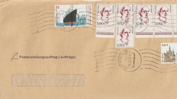 Hier ein kurioses Stück. Verklebt wurde 2* 440 Pf Palucca (2014). Entwertung am 8.10.98 per MaSt. Somit handelt es sich quasi um einen Ersttagsbeleg.